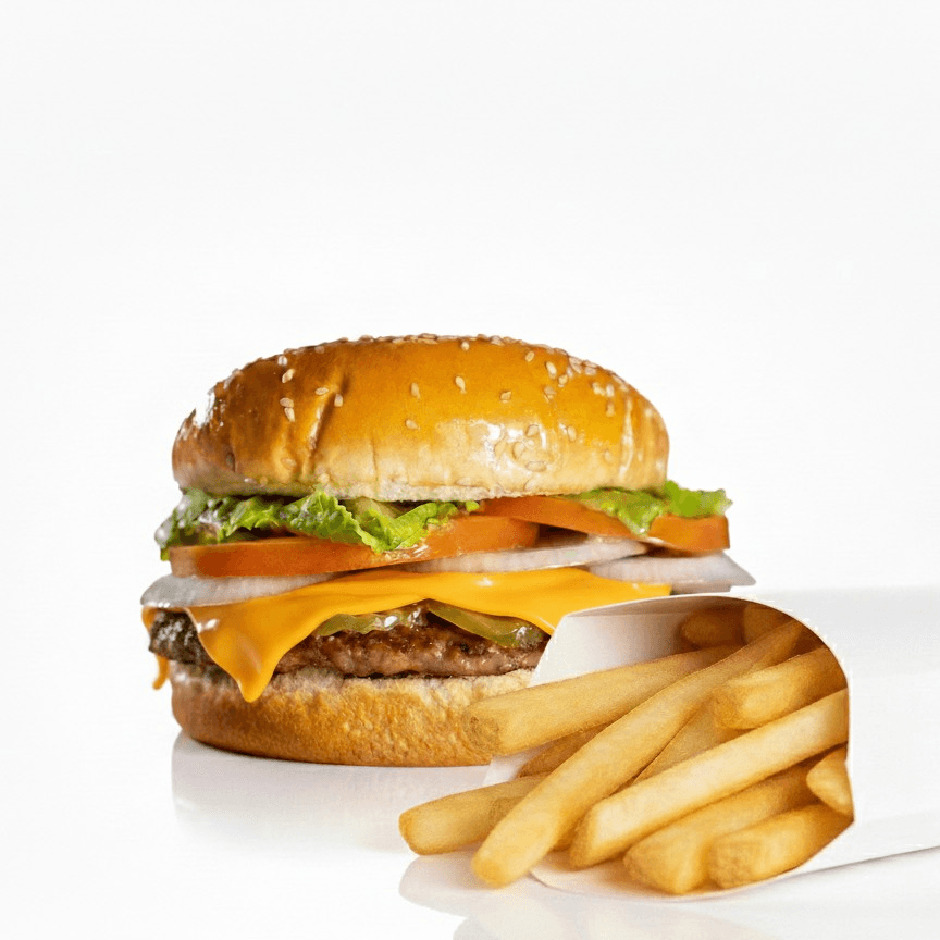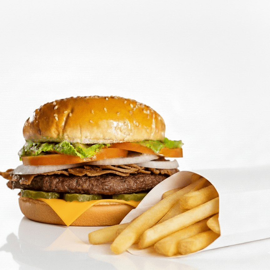 Enjoy two juicy beef patties topped with melted cheese, fresh lettuce, tomatoes, onions, tangy pickles, creamy mayo, ketchup, and mustard, all nestled in toasted buns. This meal comes with a generous serving of golden, crispy fries and a refreshing drink of your choice. Perfect for sharing or satisfying a hearty appetite!