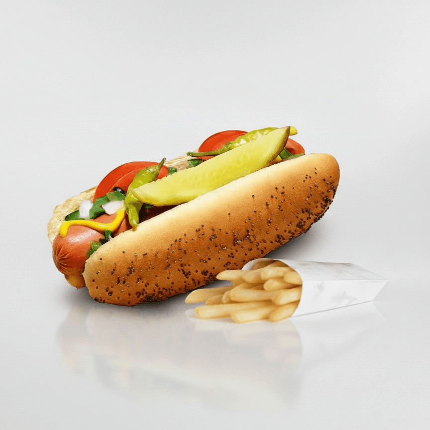 Get ready for an explosion of flavors with our Chicago Style Hot Dog. A premium all-beef frankfurter nestled in a steamed poppy seed bun. We top it the traditional way with yellow mustard, chopped white onions, bright green sweet pickle relish, fresh tomato wedges, a crisp pickle spear, spicy sport peppers.