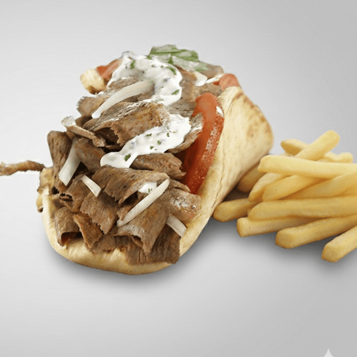 "Savory gyro meat topped with refreshing cucumber sauce, crisp onions, fresh tomatoes, and crunchy lettuce, all wrapped in a warm pita. The ultimate Mediterranean classic!"