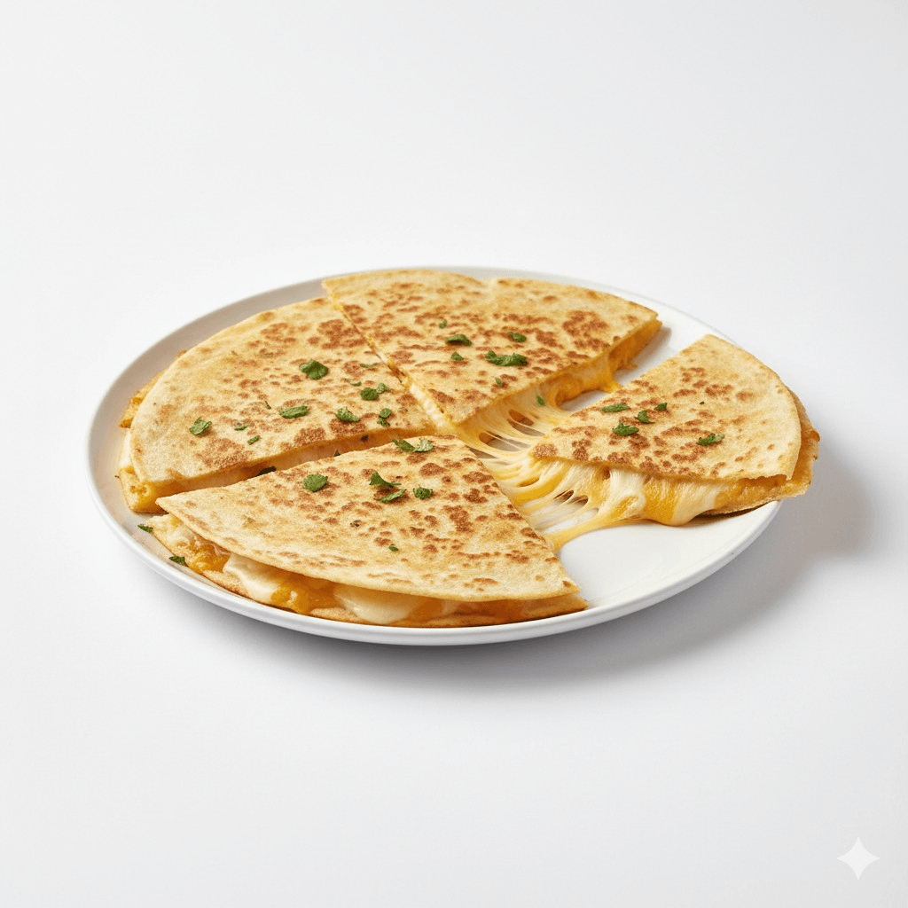 "Golden corn tortilla stuffed with a rich blend of melted cheeses, grilled to crispy perfection. Simple, cheesy, and delicious."