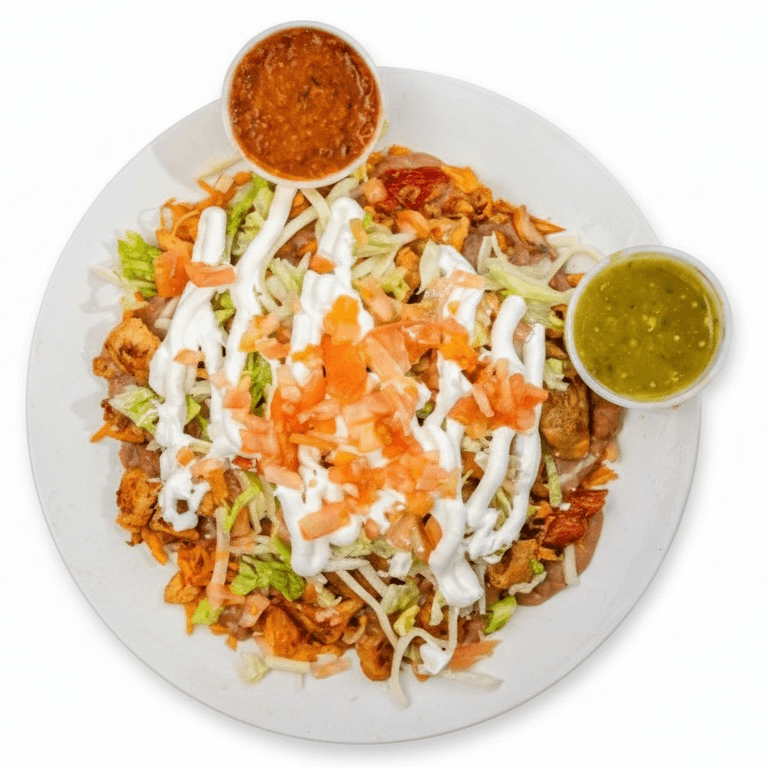 "Crispy golden corn tortillas topped with savory seasoned beef, fresh shredded lettuce, and juicy diced tomatoes, all complemented by a rich and velvety sour cream for a perfect balance of flavors."