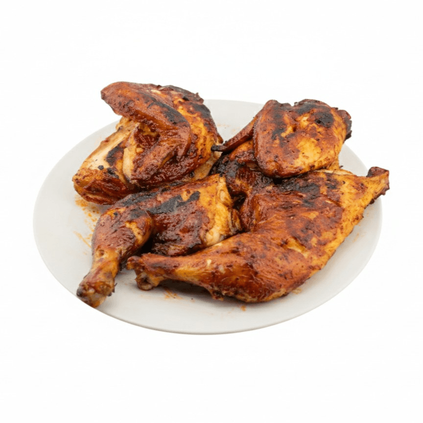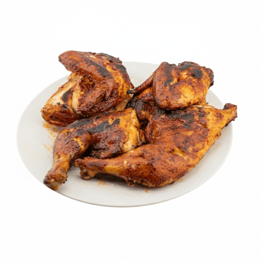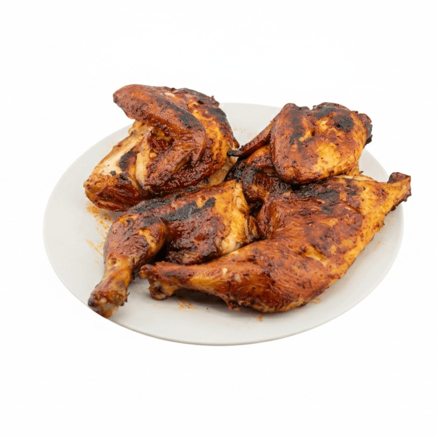 "Authentic charcoal-grilled half chicken, marinated in bold Mexican spices. Tender, smoky, and perfectly charred."