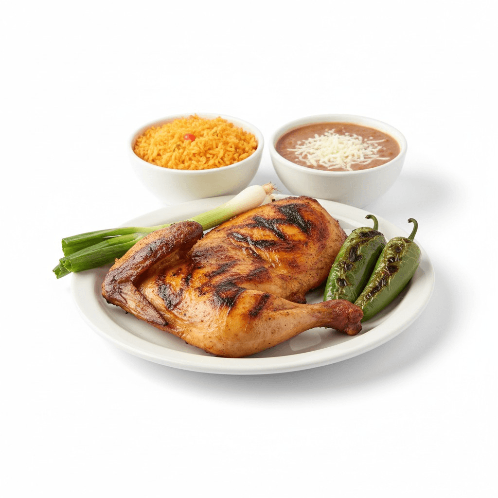 Mexican 1/2 Chicken Combo "Flame-grilled half chicken served with authentic Mexican rice, refried beans, charred onions, and grilled jalapeños."