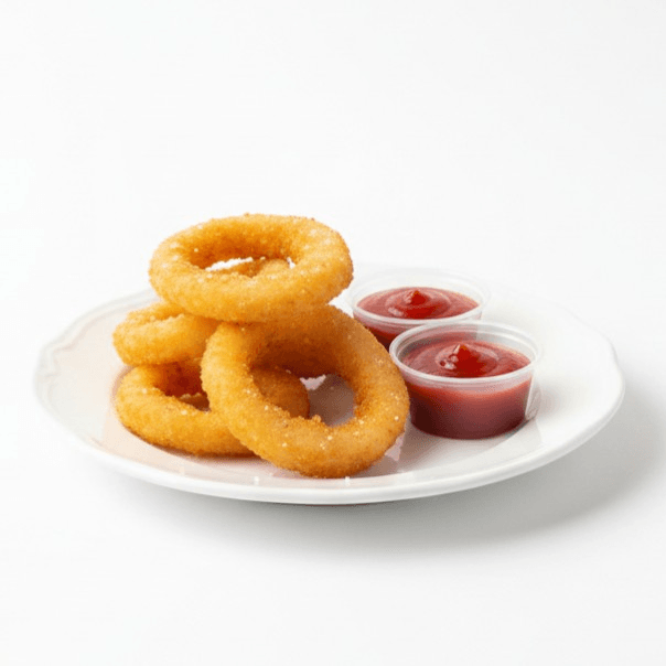 Golden Crispy Onion Rings "Perfectly battered and fried to a golden crisp. Served with two sides of rich tomato ketchup for the ultimate dipping experience.