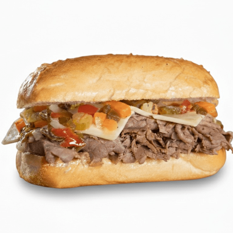 "Tender, thinly sliced steak grilled to perfection with sautéed peppers and onions, topped with melted cheese in a toasted artisan bun. A savory masterpiece in every bite."