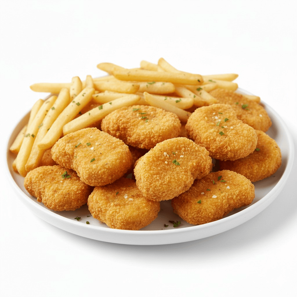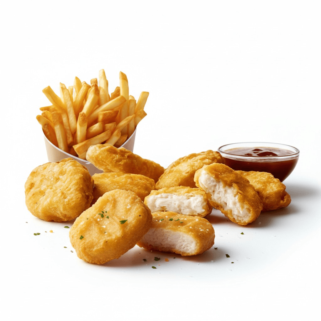 "Irresistible Golden Crunch! 🍗🍟🥤" Pure chicken nuggets, crispy on the outside and tender inside. A complete meal served with golden fries and your favorite cold drink.