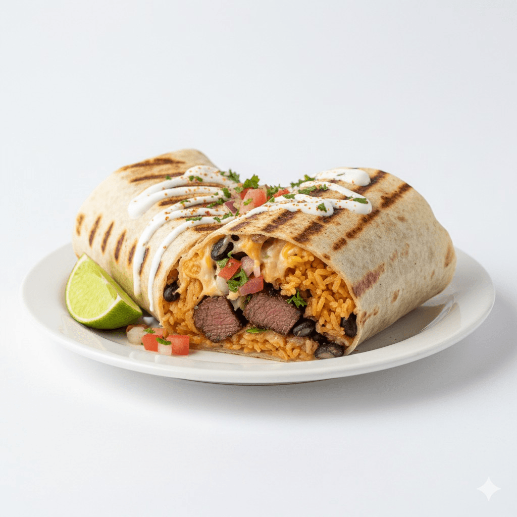 Grilled Steak Burrito "A toasted flour tortilla packed with succulent grilled steak, seasoned Mexican rice, and melted cheese, finished with a zesty lime touch for an authentic, bold flavor."