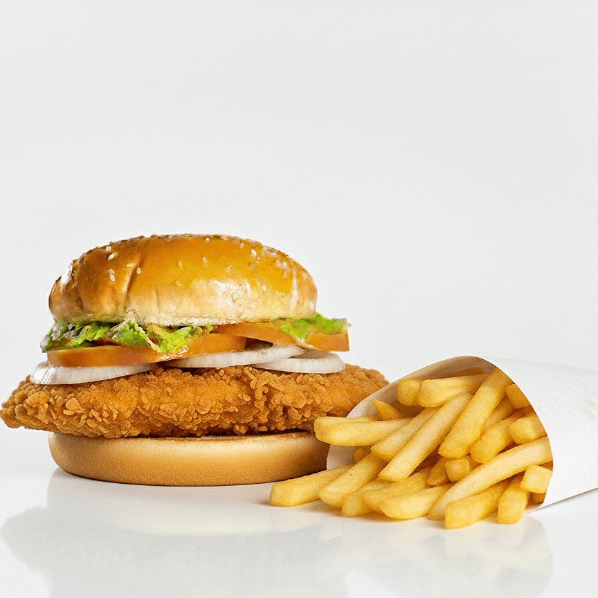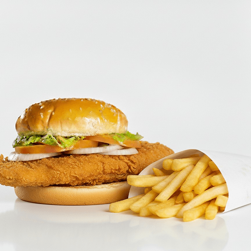 "Tender seasoned chicken grilled with peppers and onions, topped with melted cheese in a fresh artisan bun. Served with crispy golden fries."
