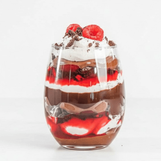 Love Potion Parfait 🍒🍫 "A decadent masterpiece of rich chocolate fudge and velvety whipped cream, layered with zesty red berry coulis and crunchy cookie crumbles. Topped with fresh raspberries for the perfect balance of sweetness and tang in every bite."