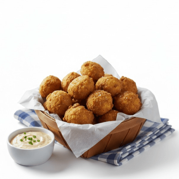 Golden Crispy Hushpuppies 🌽✨ "Traditional deep-fried cornmeal balls, crispy on the outside and tender on the inside. Served with our signature dipping sauce for the ultimate snack experience!"