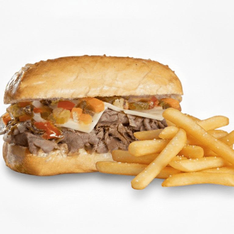 Thin sliced beef on Italian Bread with the option of peppers and cheese added. Fries & Drink included