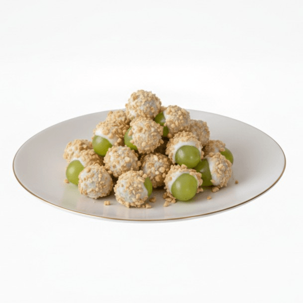 Signature Taffy Grapes 🍇✨ "Fresh, crisp green grapes hand-dipped in smooth, velvety taffy and rolled in crunchy roasted nuts. A delightful bite-sized treat that perfectly balances refreshing fruitiness with a sweet, nutty crunch."