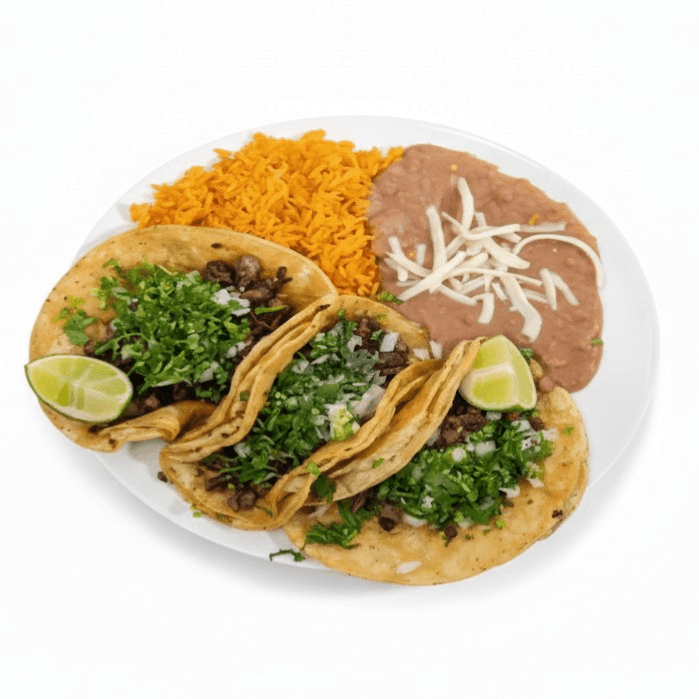 This authentic Mexican platter features three soft tacos generously filled with savory grilled meat and topped with a fresh mix of cilantro and finely chopped onions. It is served alongside a traditional portion of seasoned Mexican orange rice and hearty refried beans garnished with shredded cheese, with fresh lime wedges on the side to bring all the vibrant flavors together.